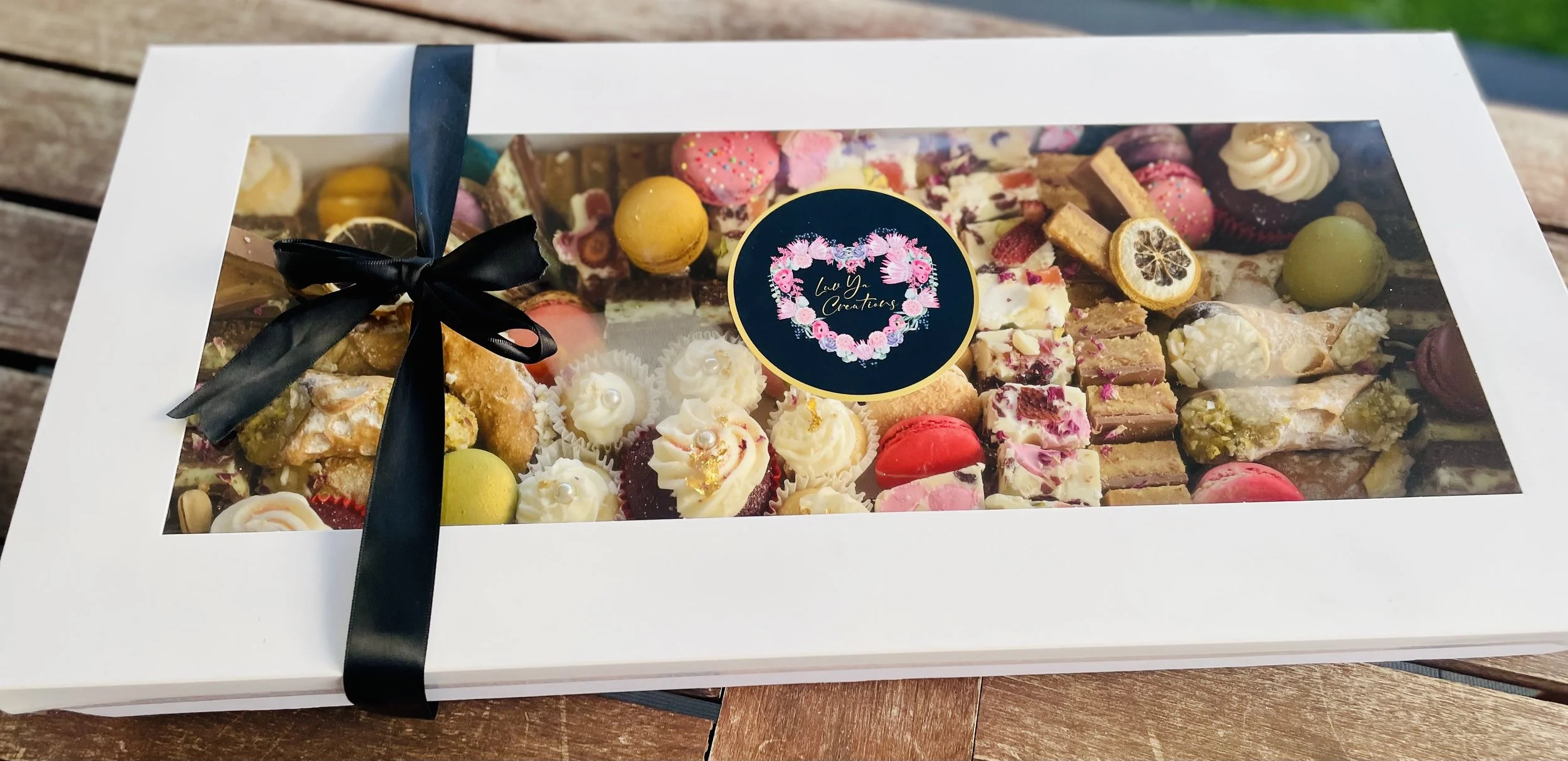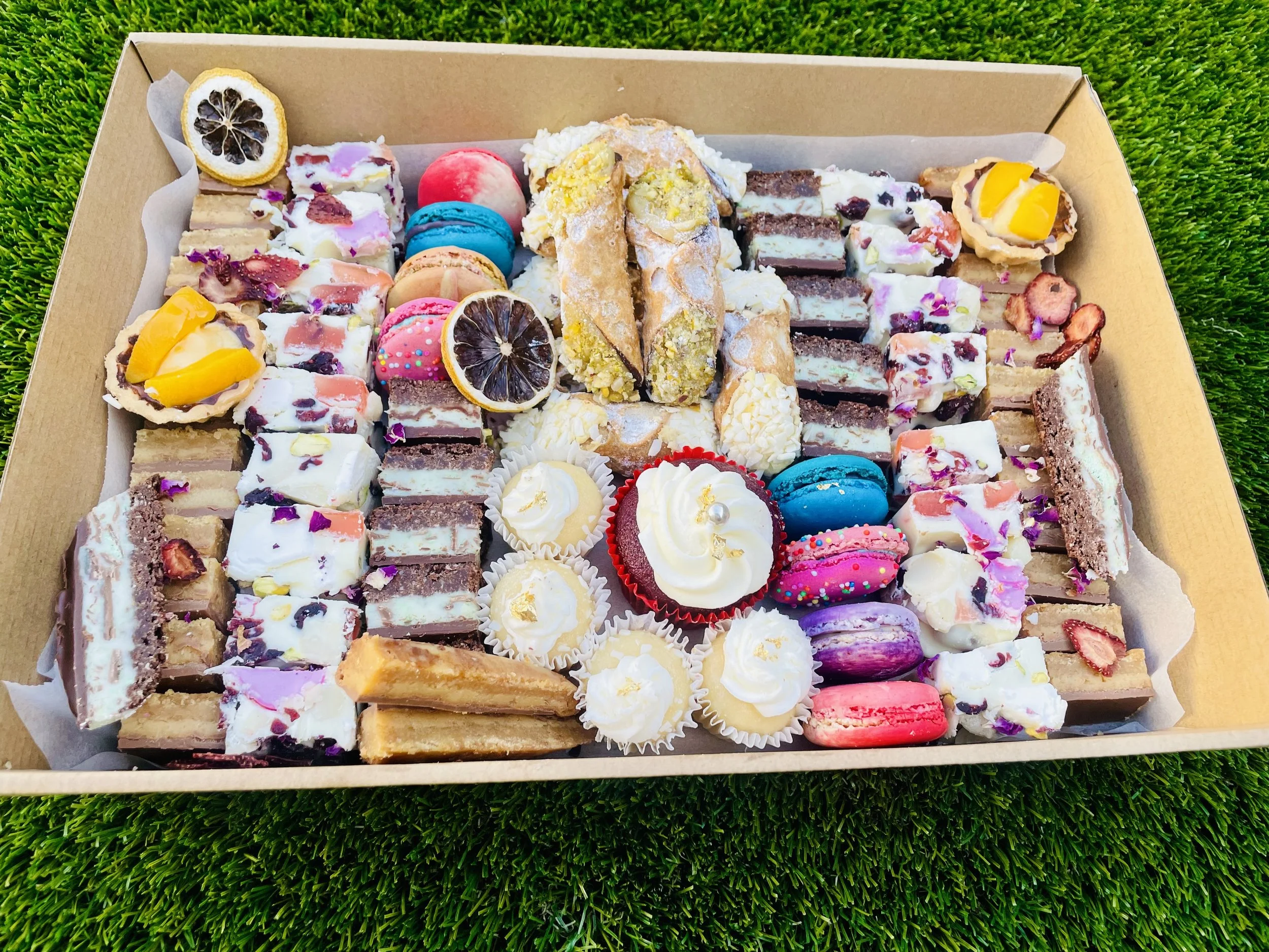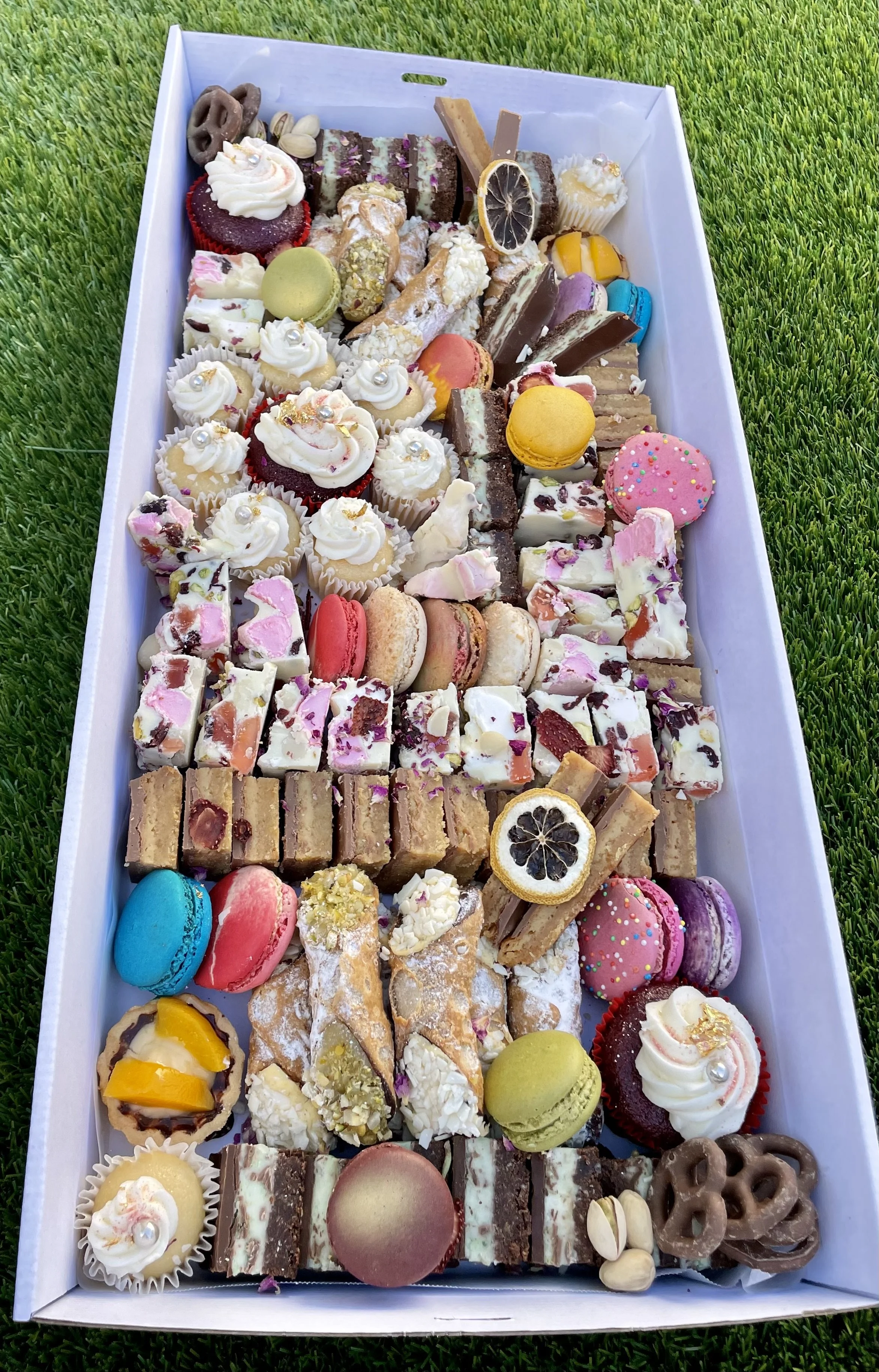 Includes: honeycomb slice, peppermint crisp, white chocolate pistachio rocky road, macaroons, custard cannoli’s, chocolate coated pretzels, mini cup cakes, peach vanilla tart.