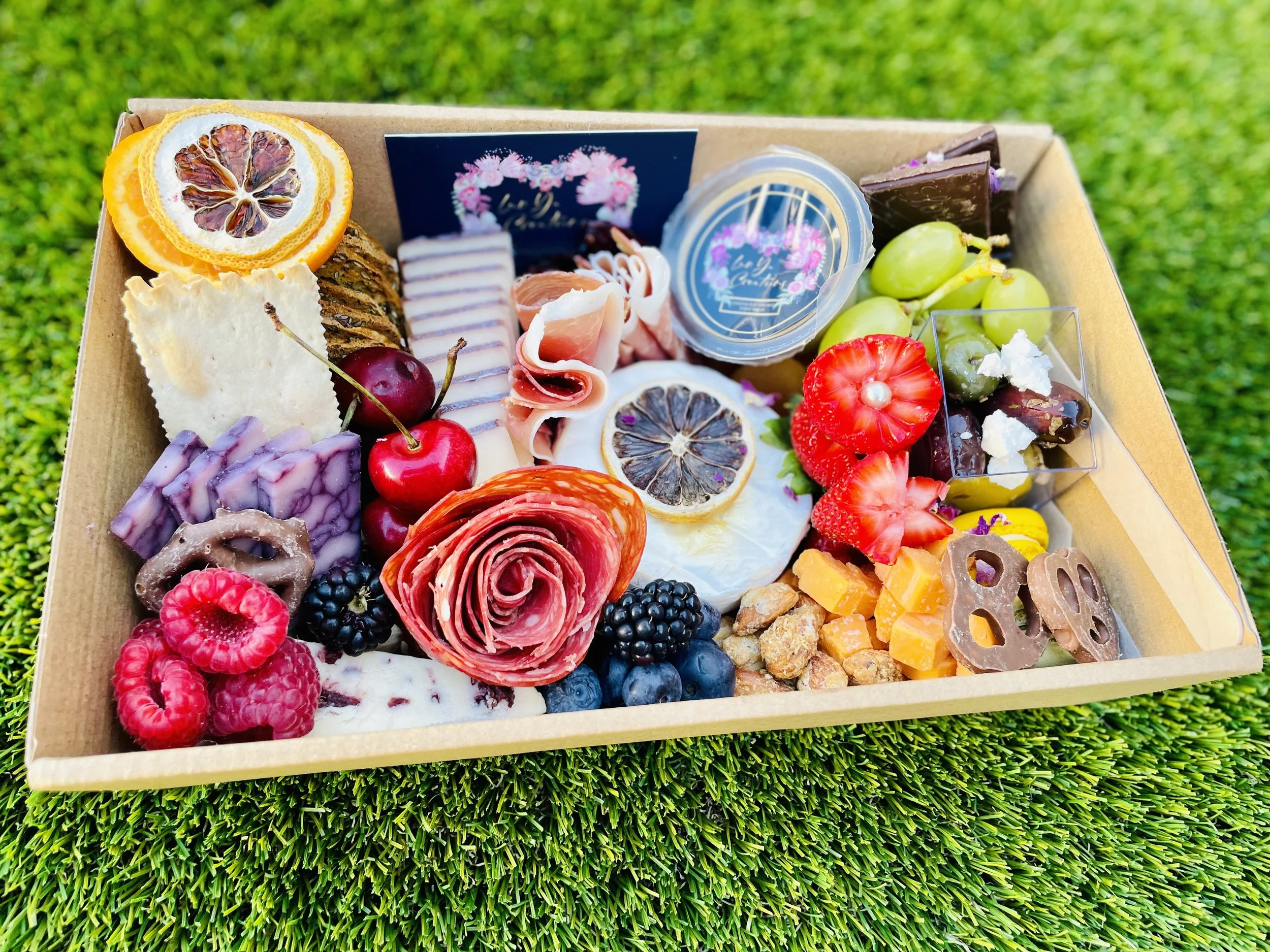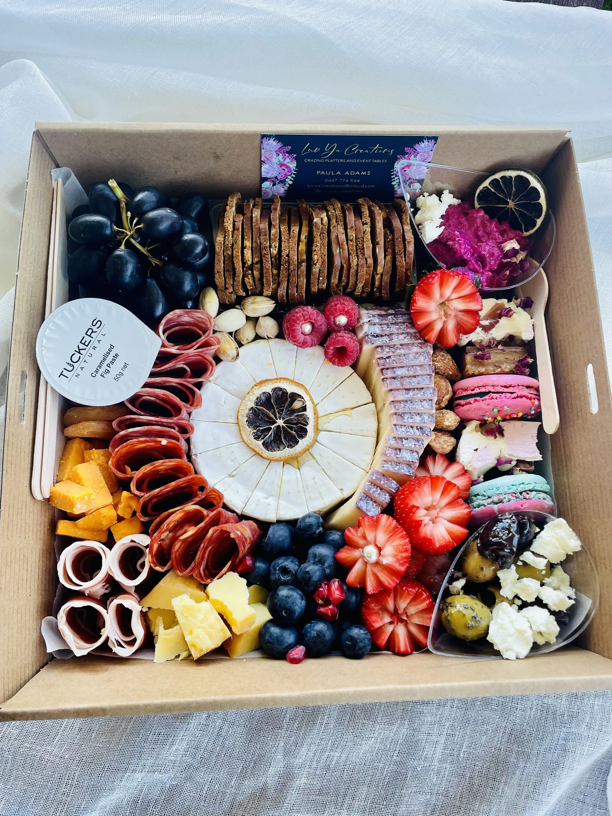 Mini round brie, hard cheese, salami rosette, prosciutto, crackers, pate, olives, seasonal fresh and dried fruit, nuts, macaroons, dark chocolate, honey and edible decorations. Disposable serving knives and spoons included.