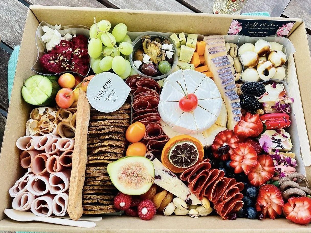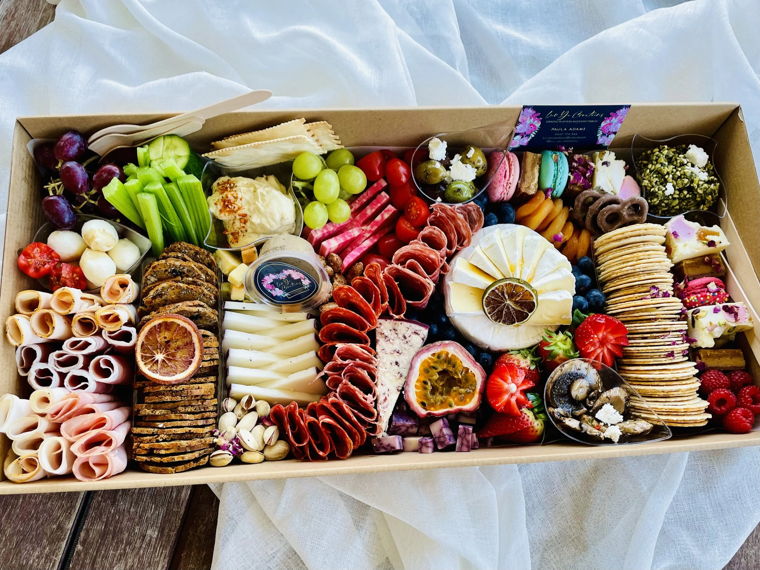 Brie topped with a mini camembert, soft and hard cheeses, bocconcini with glazed balsamic, hot and mild salami, ham, lemon chicken, prosciutto, artisan crackers, dips, mini pate, antipasto olives, marinated mushrooms, veggie crudité’s, fruit paste, seasonal fresh and dried fruits, nuts, macaroons, homemade white chocolate pistachio rocky road, homemade honeycomb slice, chocolate coated pretzels, honey and edible decorations. Disposable serving knives and spoons included.