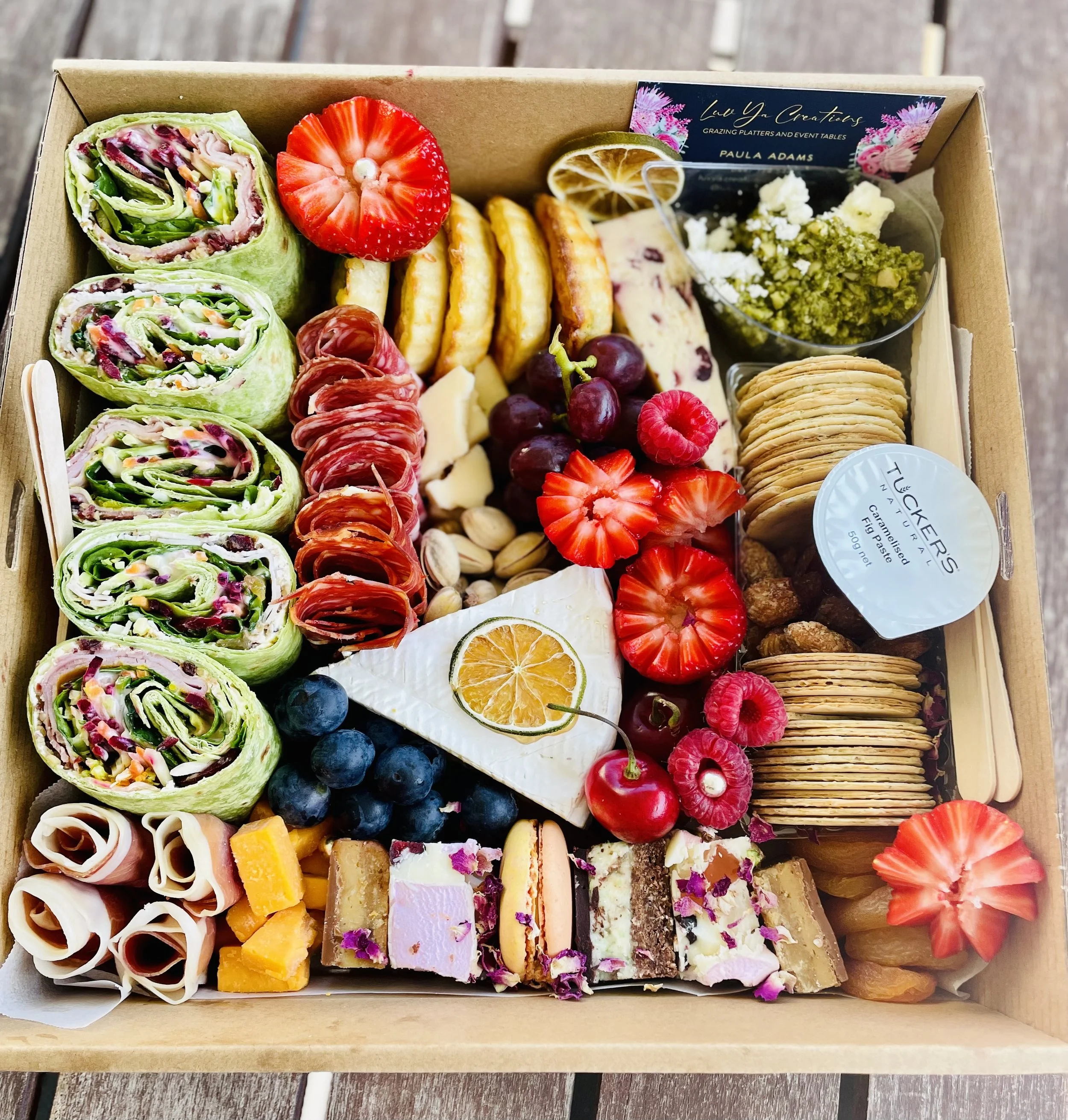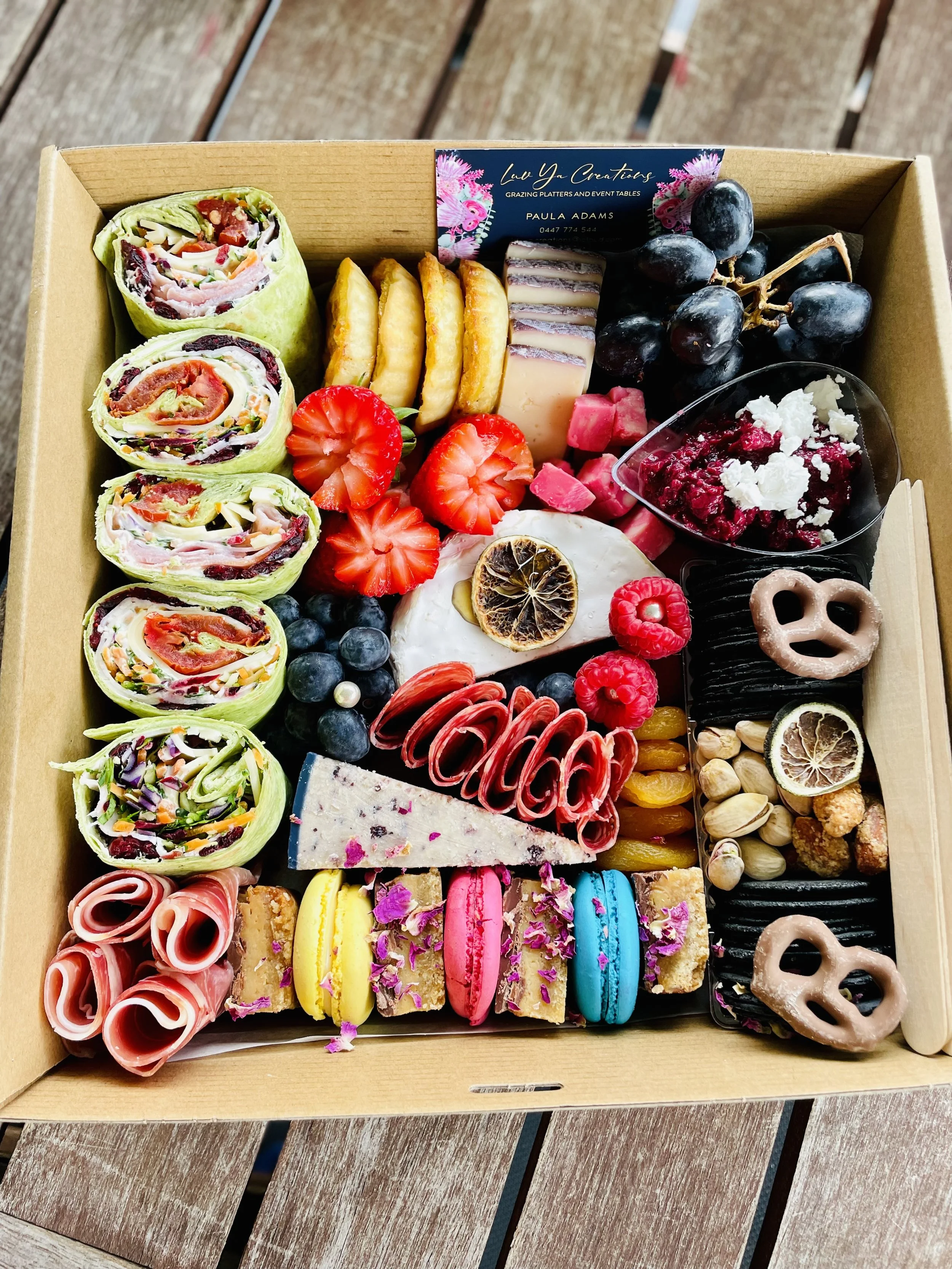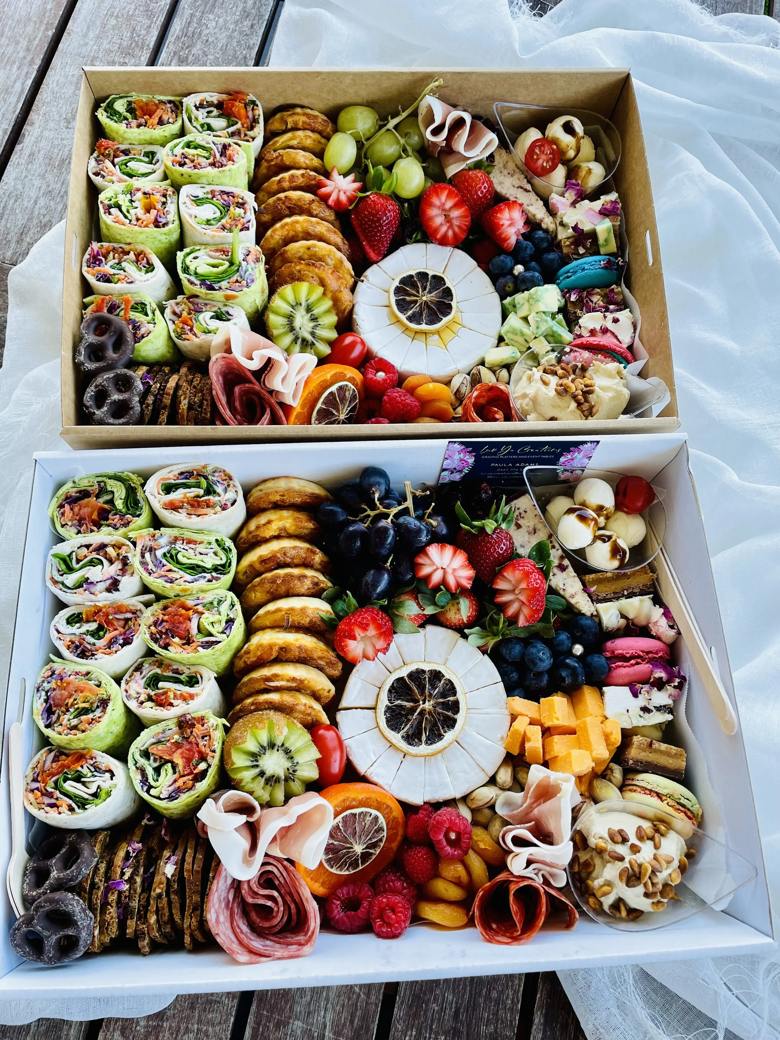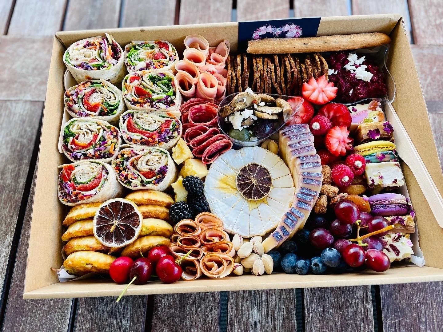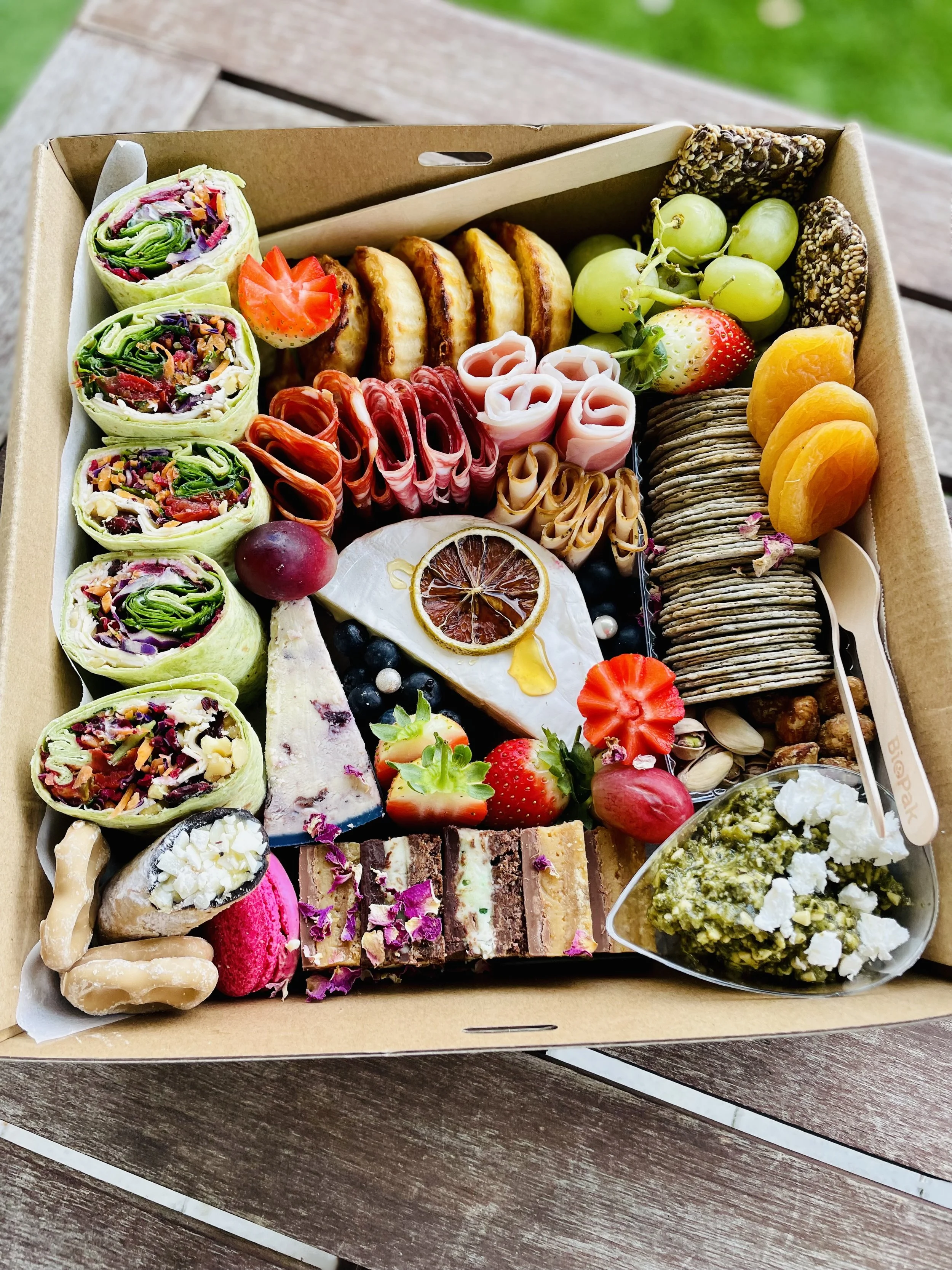 Gourmet wraps include; lemon chicken, cream cheese, cranberries, walnuts, kale slaw, bean shoots, sundried tomatoes and relish. Mini quiches, brie, soft and hard cheeses, dip, crackers, olives, seasonal fresh and dried fruit, nuts, homemade white chocolate pistachio rocky road, macaroons, honey and edible decorations. Disposable serving knives and spoons included.