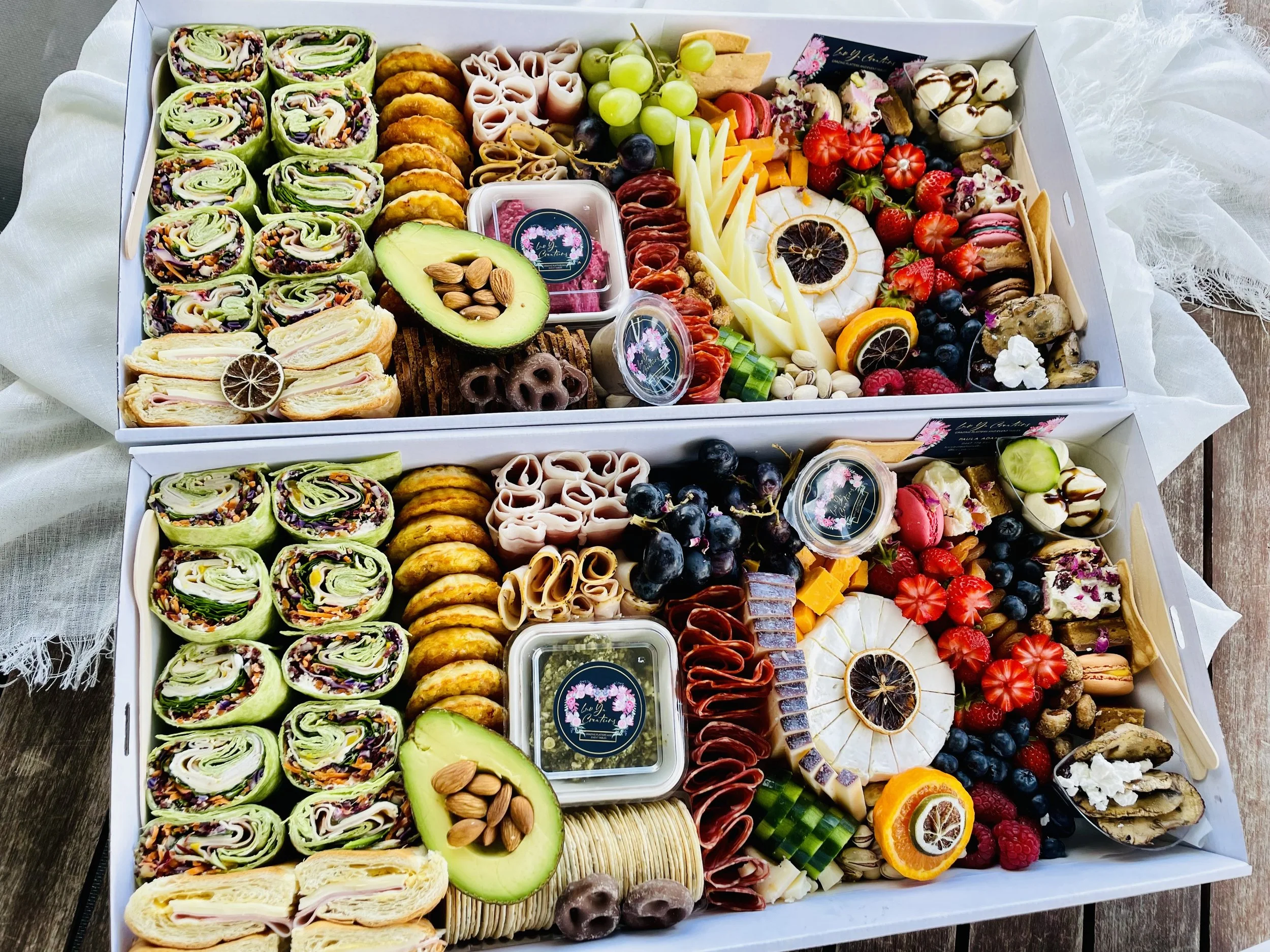 Gourmet wraps include; lemon chicken, cream cheese, cranberries, walnuts, kale slaw, bean shoots, sundried tomatoes and relish. Mini quiches, mini brie, soft and soft and hard cheeses, dip, crackers, seasonal fresh and dried fruit, nuts, macaroons, honey and edible decorations. Disposable serving knives and spoons included.