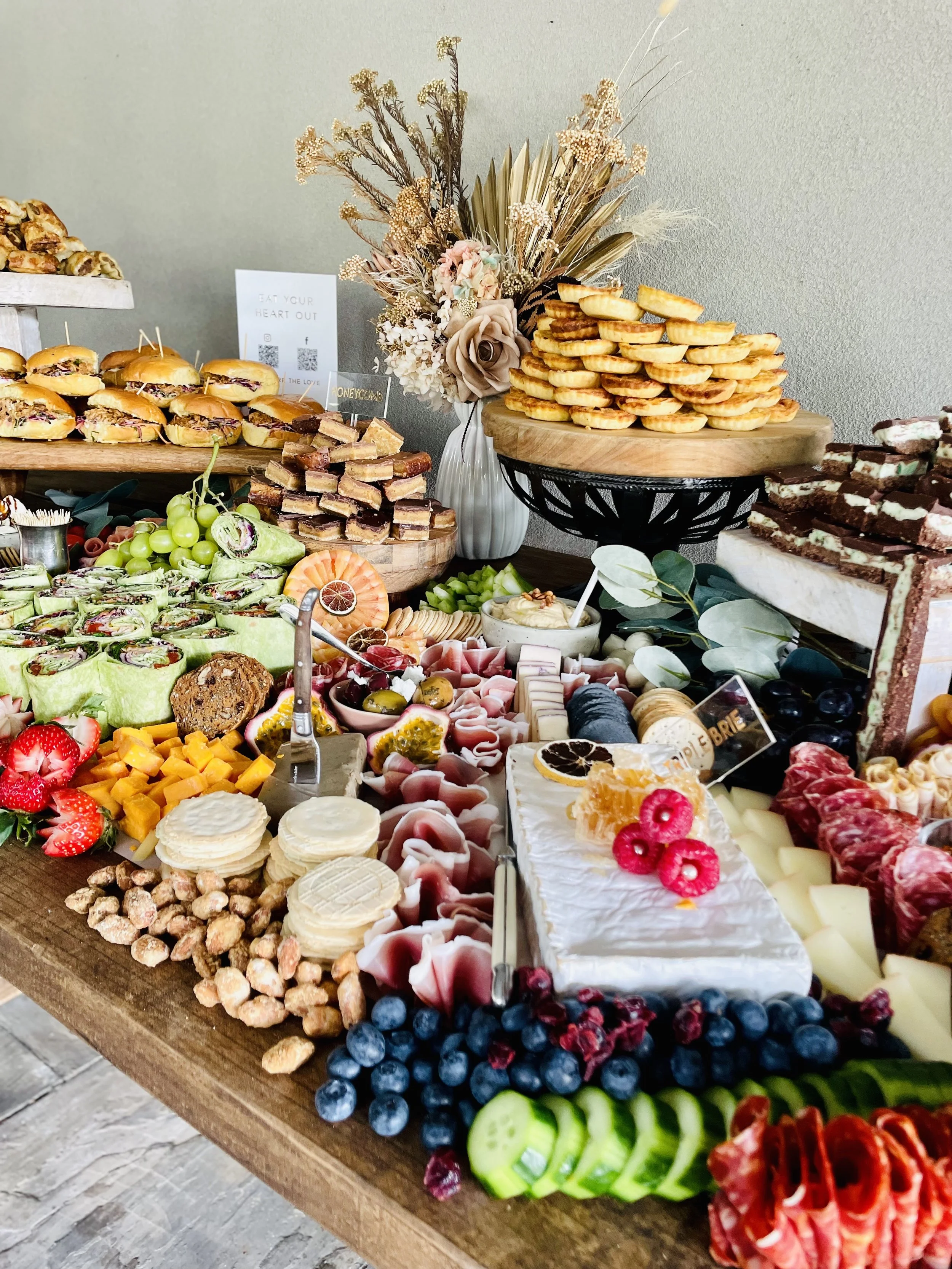 Soft and Hard Cheeses - Wheels of brie or camembert, decorated with fresh honeycomb (sourced locally) manchego, blueberry, cranberry, gouda, merlot, smoked cheddar, blue cheese, red leicester, port wine and bocconcini- just to name a few- produce is dependent on availability.